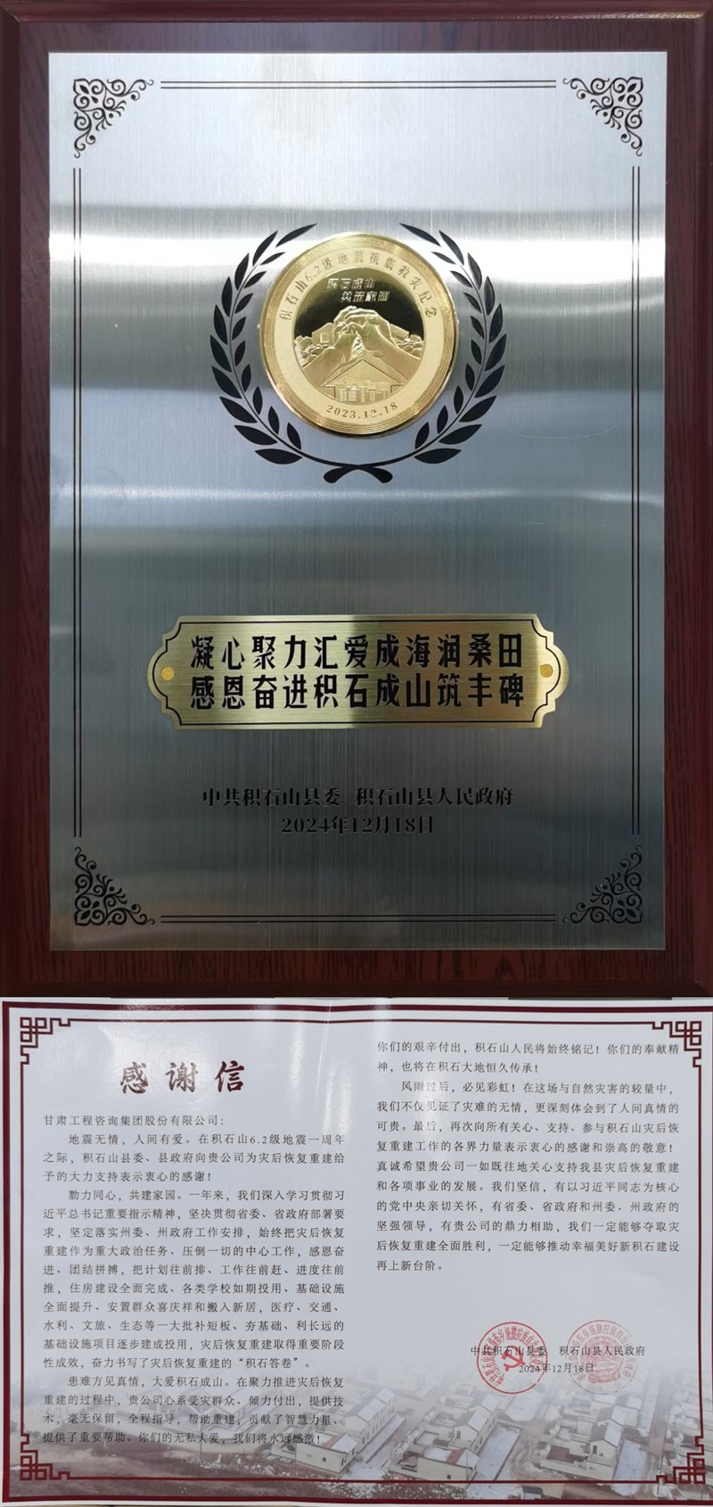 1月22日,時(shí)值北方農(nóng)歷小年。中共積石山縣委、積石山縣人民政府為甘肅工程咨詢集團(tuán)送來感謝信,對甘肅工程咨詢集團(tuán)在災(zāi)后恢復(fù)重建給予的大力支持表示感謝,并致以節(jié)日問候。