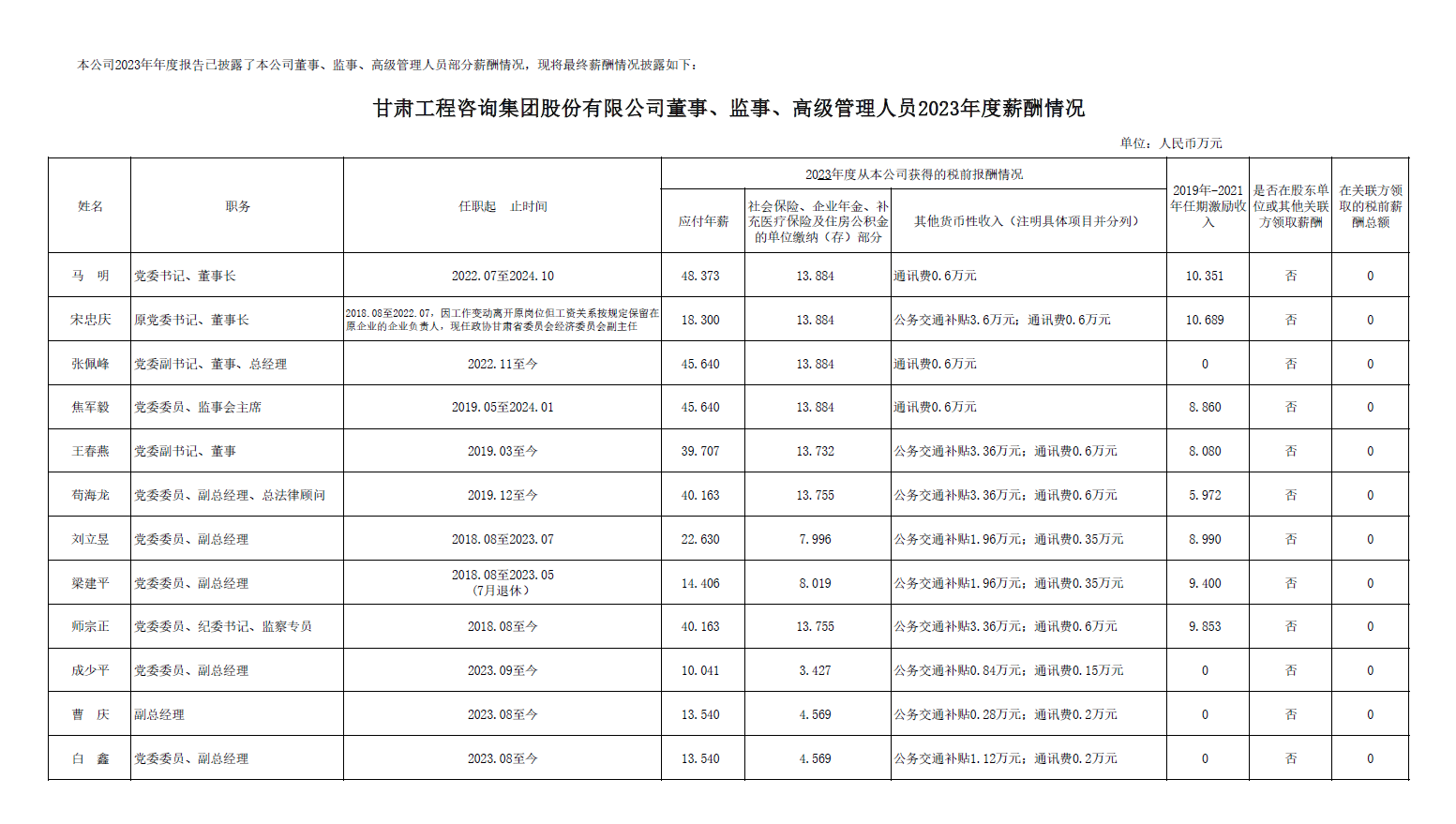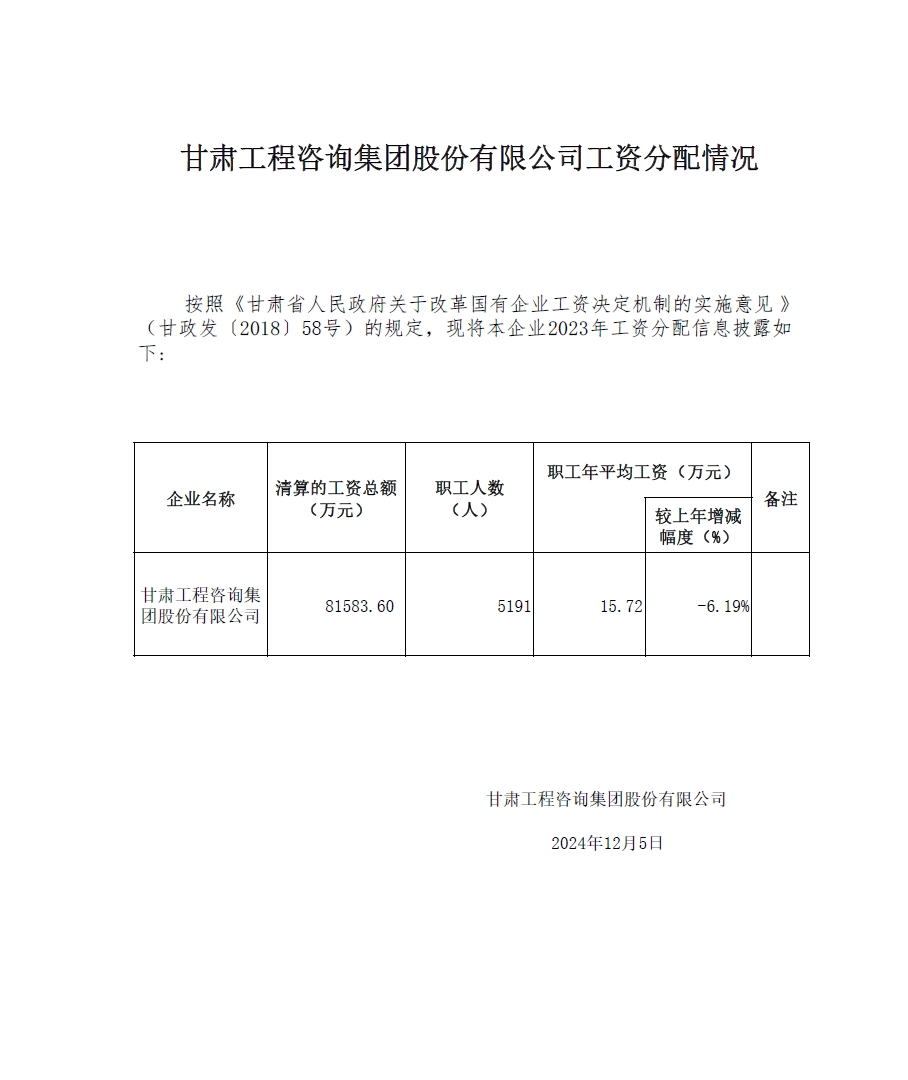 甘肅工程咨詢集團(tuán)股份有限公司董事、監(jiān)事、高級管理人員2023年度薪酬情況及甘肅工程咨詢集團(tuán)股份有限公司工資分配情況