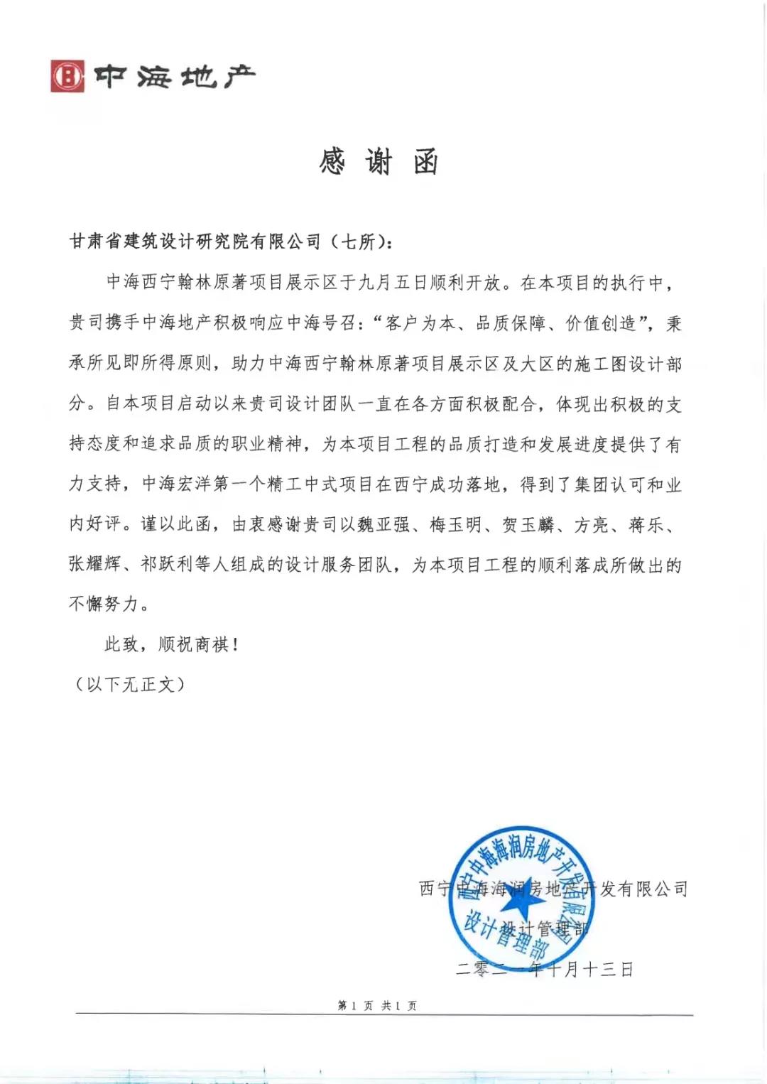 感謝信是認可,是鼓勵,也是鞭策,建筑設計院全體職工紛紛表示,要向設計七所西寧中海翰林原著項目設計團隊學習,立足市場、抓好服務,至臻至善、追求卓越,建功新時代,奮進新征程。