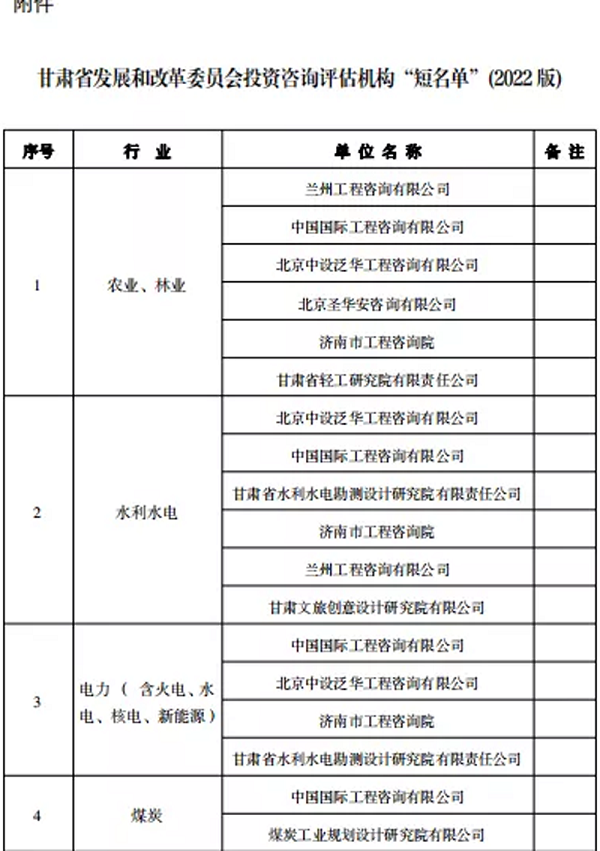 近日,省發改委公布2022年進入省發改委投資咨詢評估機構企業名單,甘肅省水利水電勘測設計研究院有限責任公司成功入圍三個行業板塊。