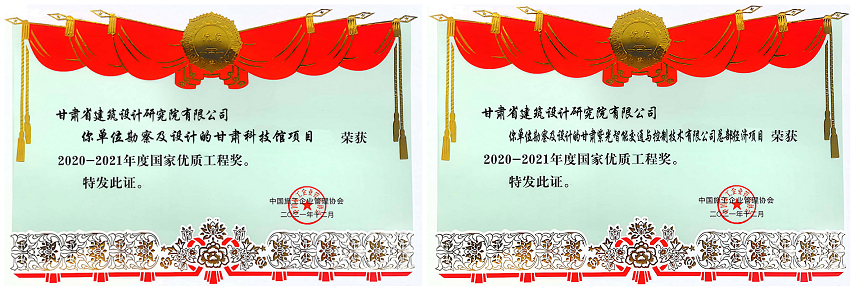 日前,從中國(guó)施工企業(yè)管理協(xié)會(huì)傳來(lái)喜訊,由甘肅省建筑設(shè)計(jì)研究院有限公司勘察及設(shè)計(jì)的“甘肅科技館項(xiàng)目”和“甘肅紫光智能交通與控制技術(shù)有限公司總部經(jīng)濟(jì)項(xiàng)目”榮獲2020—2021年度國(guó)家優(yōu)質(zhì)工程獎(jiǎng)。