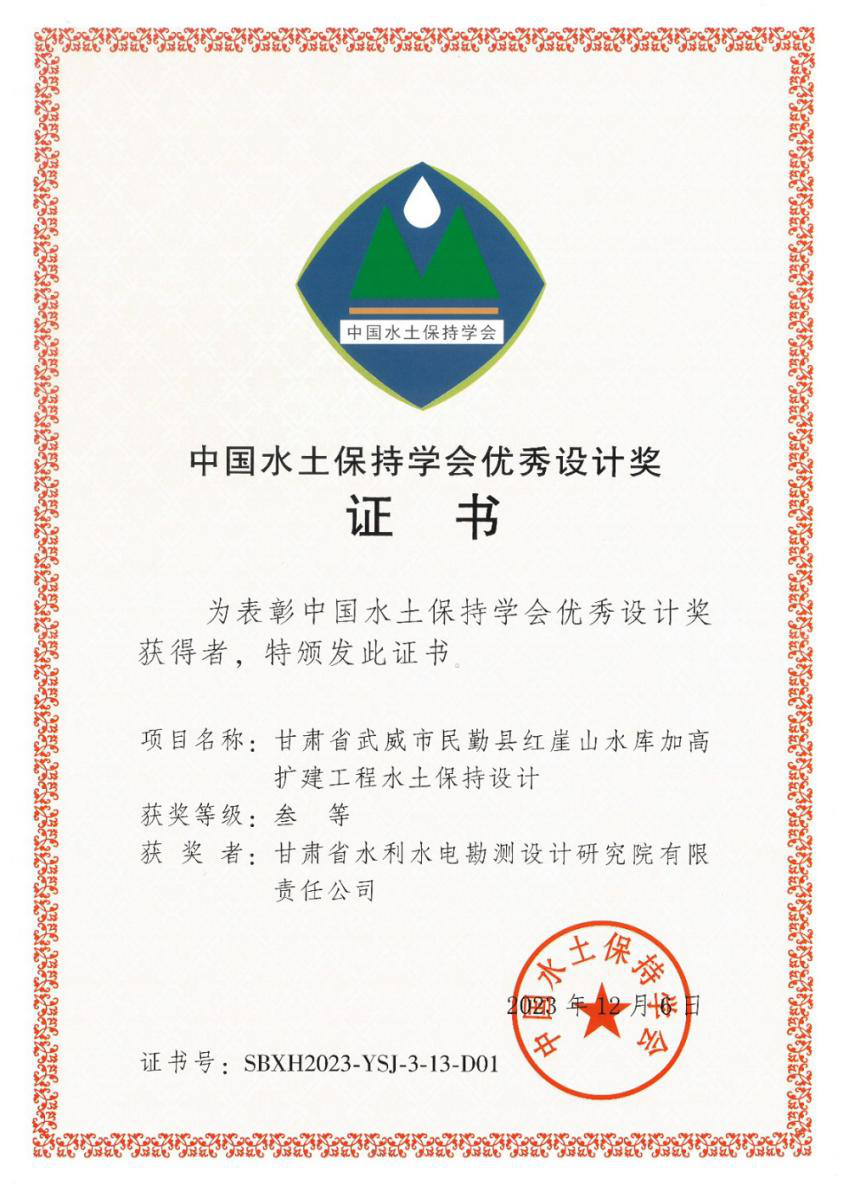 據悉,這是繼《甘肅省引洮供水一期工程水土保持設計》獲第三屆中國水土保持學術大會優秀設計二等獎后,再次喜獲此獎項。中國水土保持學術大會制度自2018年建立以來,中國水土保持學會搭建了我國水土保持領域規模最大、水平最高的學術交流平臺,現已成為中國水土保持學術交流的重要品牌。中國水土保持學會優秀設計獎每兩年評選一次,主要獎勵我國在水土保持規劃與設計領域中技術先進、成效顯著、理念創新的項目成果。