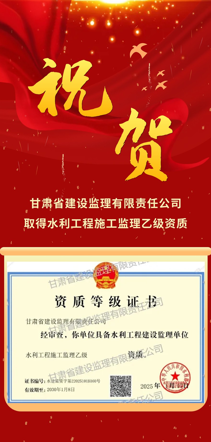 省建設監(jiān)理公司取得水利工程施工監(jiān)理乙級資質(zhì)