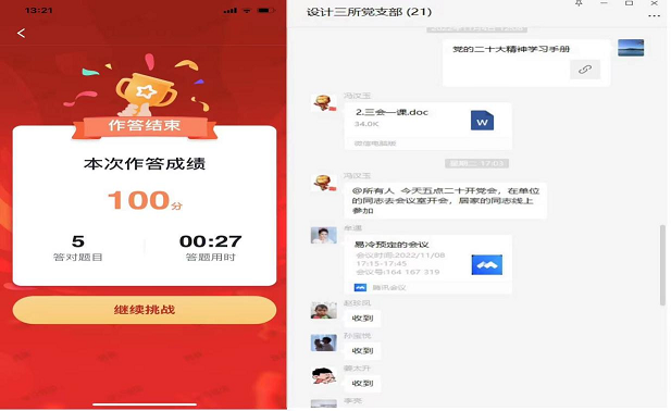以賽促學(xué),強(qiáng)技礪能精研細(xì)琢。各黨支部組織黨員通過學(xué)習(xí)強(qiáng)國“黨的二十大精神答題活動”“黨的二十大精神應(yīng)知應(yīng)會百題”等形式,開展線上答題競賽,全面檢驗(yàn)黨員干部對黨的二十大報告內(nèi)容的掌握程度,進(jìn)一步增強(qiáng)黨員干部對學(xué)習(xí)黨的二十大精神的認(rèn)識和重視,推動黨的二十大精神入腦入心,鞏固提升學(xué)習(xí)效果,以賽促學(xué)、以知促行,用黨的二十大精神武裝頭腦、指導(dǎo)實(shí)踐、推動工作。
